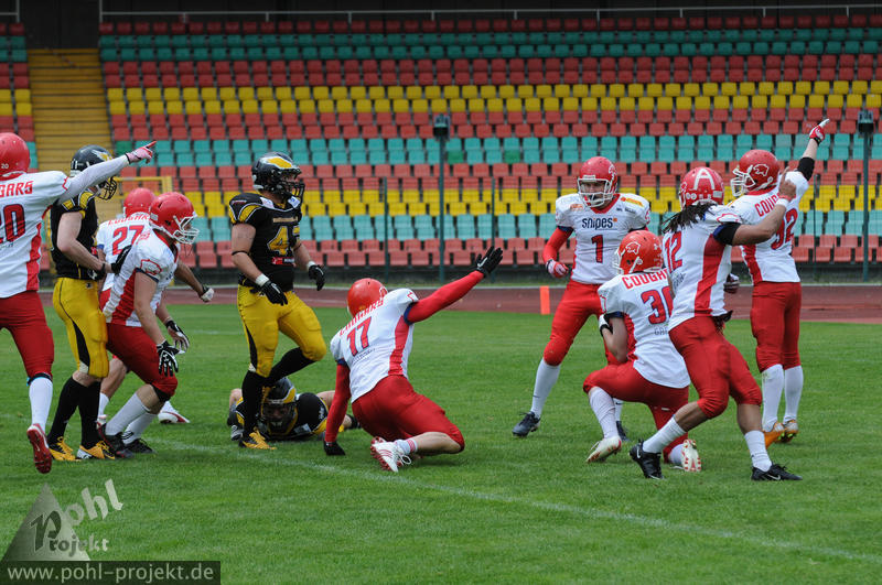 Berlin Adler vs Lübeck Cougars am 13.5.2012 in Berlin - Friedrich-Ludwig-Jahn-Stadion , Football - Bilder vom Spiel